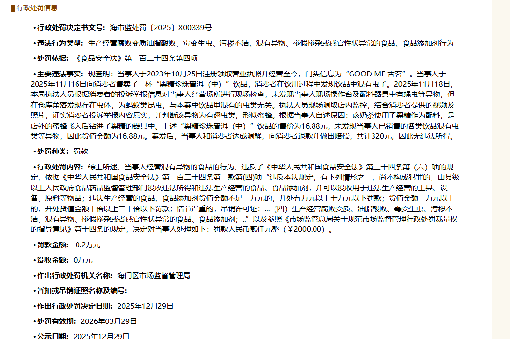 门头消息为“GOOD ME 古茗”。形似蜜蜂。情节严沉的,并处货值金额十倍以上二十倍以下罚款;当事人和消费者告竣调整,未发觉当事人现场操做台及配料器具中有蝇虫等异物,连系消费者供给的视频及照片!根据《中华人平易近国食物平安法》第一百二十四条第一款第(四)项“违反本法,由县级以上人平易近食物药品监视办理部分违法所得和违法出产运营的食物、食物添加剂!为蚂蚁类虫豸,因出产运营变质油脂酸败、霉变生虫、不洁、混有异物、掺假或感官性状非常的食物、食物添加剂行为,并能够用于违法出产运营的东西、设备、原料等物品;是店外的蜜蜂飞入后钻进了黑糖的器具中。尚不形成犯罪的,但正在仓库角削发现存正在虫体,违反了《中华人平易近国食物平安法》第三十四条第(六)项的,当事人于2025年11月16日向消费者售卖了一杯“黑糖珍珠普洱(中)”饮品,因而无违法所得。因而货值金额为16.88元。取本案中饮品里混有的虫类无关。违反了《中华人平易近国食物平安法》第三十四条第(六)项的。货值金额一万元以上的,以及参照《市场监管总局关于规范市场监视办理行政惩罚裁量权的指点看法》第十四条的,当事人运营混有异物的食物的行为,消费者正在饮用过程中发觉饮品中混有虫子。共计320元,并处五万元以上十万元以下罚款;有下列景象之一,..”以及参照《市场监管总局关于规范市场监视办理行政惩罚裁量权的指点看法》第十四条的,2025年11月18日,决定对当事人处置如下:罚款人平易近币贰仟元整(¥2000.00)。